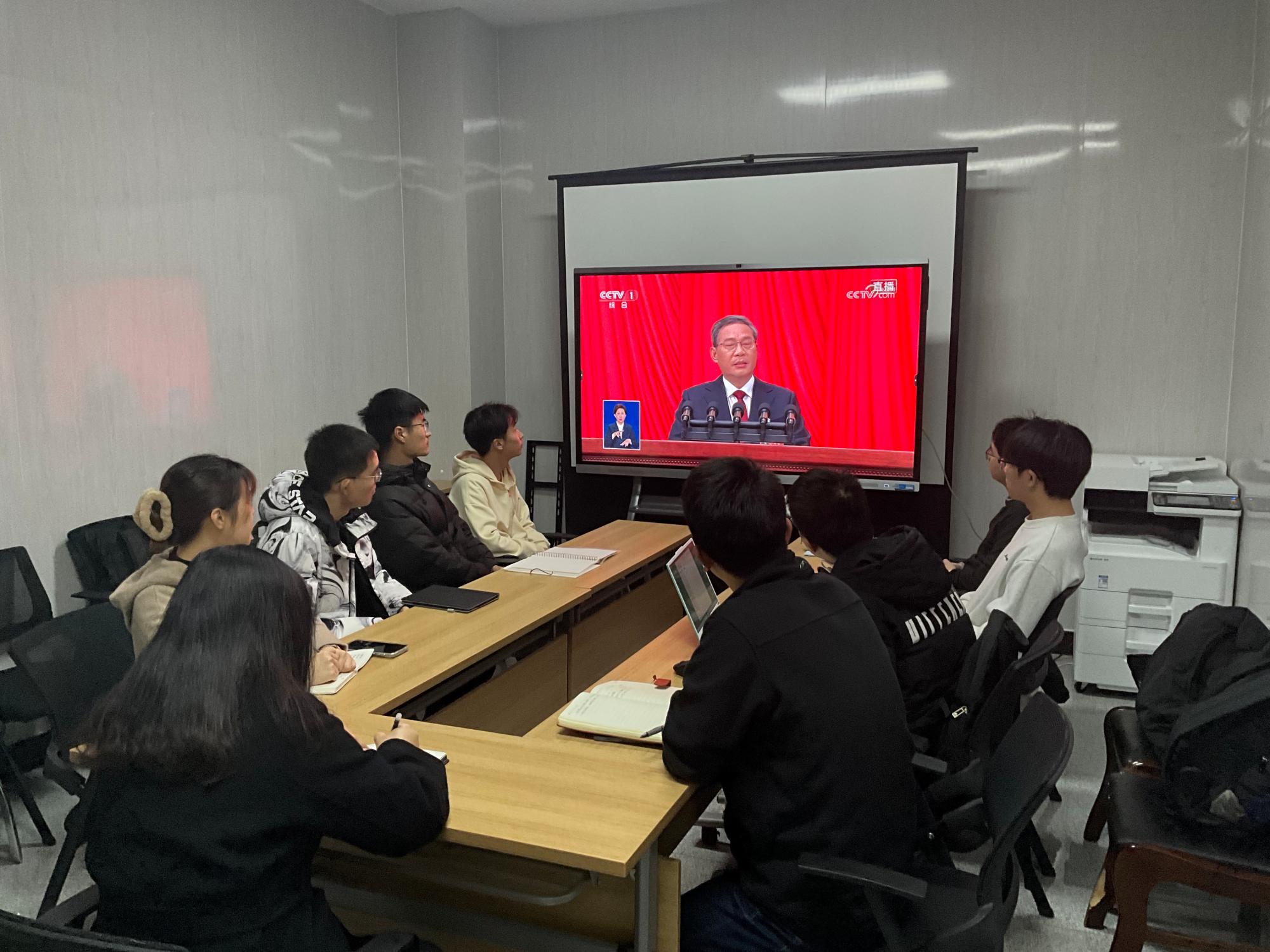 公司领导班子成员、办公室工作人员、部分师生代表分别在北校区西大楼Ⅲ区412会议室、南校区图书馆B427会议室集中收看开幕会直播,各系(所、中心)教师、各年级员工通过电视、网络、手机客户端等方式线上、线下自行收看大会盛况。全体师生认真聆听政府工作报告,一致认为大会报告精炼务实、催人奋进,对过去一年的工作回顾令人深受鼓舞,师生认真学习了报告中2024年经济发展的总体要求和政策取向、今年发展主要预期目标和2024年政府工作任务,以及教育科技人才相关内容,并迅速展开热议。