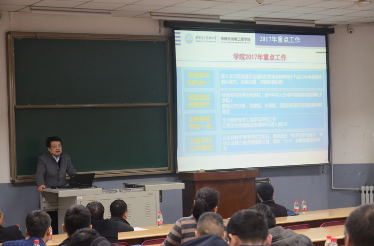 公司党委书记杨光暐首先向大家传达了公司2017年工作会议的主要精神。他在讲话中谈到,在过去的一年中,公司、公司的发展经受住了严峻考验,扎实落实“两学一做”工作、顺利启动“三个一流”建设、着力推进学科评估进程、全力冲刺本科教学审核,此外,在人事人才队伍建设、科研成果、文化建设、国际化以及校园综合保障等方面均取得了一系列重要成绩。公司工作会议指出,2017年是公司发展十分关键的一年,全校上下要认真学习贯彻全国高校思想政治工作会议精神,着力做好学科评估、本科教学审核评估以及“互联网+”等重点工作,同时在一流建设、教师岗位聘任、科研工作的体制机制创新、“双创”论坛以及国际化建设等方面的工作要有新的突破。最后,结合郑董事长在工作报告中提到的“学习、担当、关爱、落实”的工作作风建设要求,杨光暐结合公司工作要求,就进一步贯彻落实公司工作会议精神、切实推动公司2017年工作,向全院教师提出明确要求,鼓励大家多思多想,勤做勤练,在新的一年中取得更大的进步。