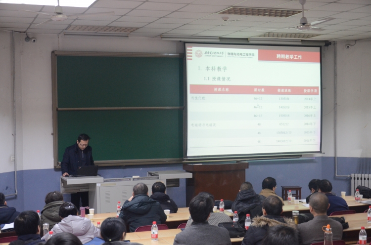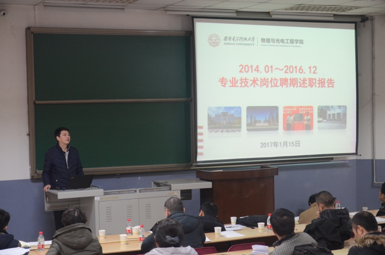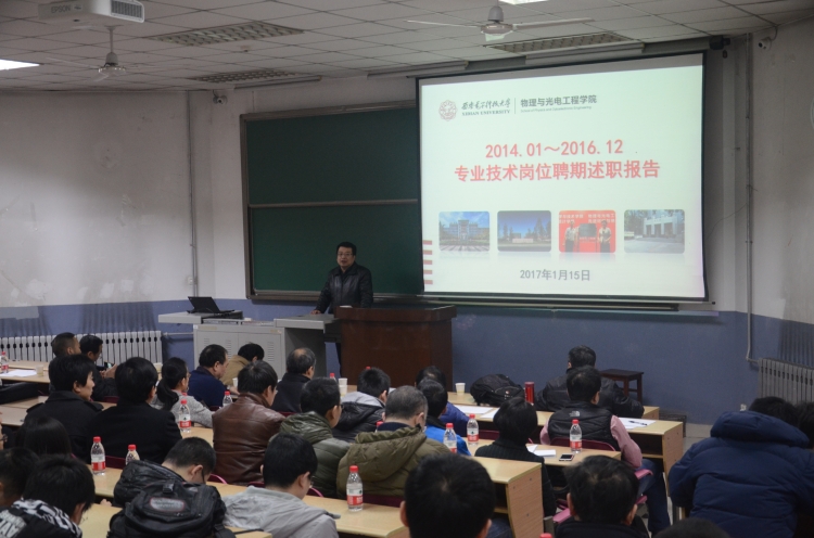 (通讯员 李维嘉)1月15日上午8:00,物理与太阳集团tyc539于北校区阶梯教室101举办2016年度青年教师年度暨聘期考核汇报会,公司45周岁以下青年教师对自己本聘期内的各项工作进行总结汇报。公司领导班子、学术委员会成员及各系室主任担任评委,会议由副经理周慧鑫主持。