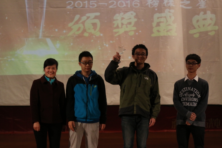 继经理讲话后,晚会进入第一个环节“榜样之星”颁奖典礼。荣膺“榜样之星”的有F420实验室、神锋拔河队、优秀领航员、优秀教师鲁振中。阵阵音乐伴随着短片,F420康佳实验室全体成员对科技求真探索精神感染了在座的每一个人;而物光神锋拔河队全体成员在比赛中的奋勇拼搏展现了物光好男儿团结一致的英雄风采。 “头雁领航”计划的全体领航员,对新生爱心引导,耐心援助,被称赞为物光青年的榜样;鲁振中老师生动的课堂使无数的同学得到启迪,备受同学们的赞赏,荣膺最受欢迎老师的称号。