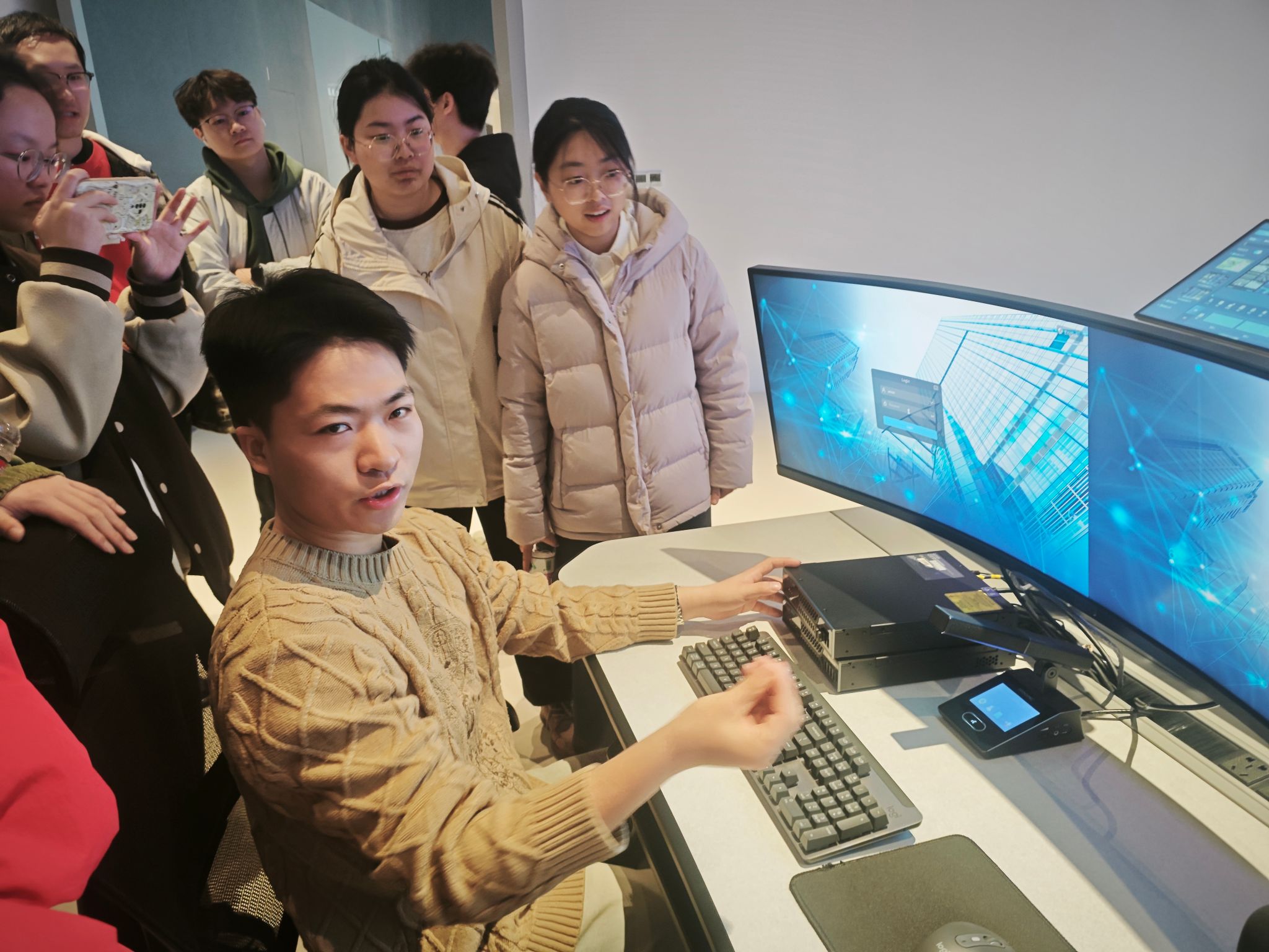 从产学研用感悟诺瓦星云智能制造模式。在传统制造向智能制造转型的浪潮中,科技创新是核心驱动力。踏入诺瓦星云的展厅,同学们瞬间被巨大的LED显示屏所震撼。这些显示屏色彩鲜艳、画质清晰,无论是精细的图像展示,还是流畅的动态视频播放,都展现出极高的技术水准。工作人员介绍,从芯片技术到驱动系统,再到显示控制软件,诺瓦星云实现了全产业链的自主研发与创新。李欣桐提到“这次研学让我深刻认识到光电显示技术在智能制造领域的魅力,对我个人而言,这是一次知识与视野的双重拓展,让我明白在今后的学习中,要更注重理论与实践结合,培养产学研用创新思维,为未来投身智能制造领域打下坚实基础。”