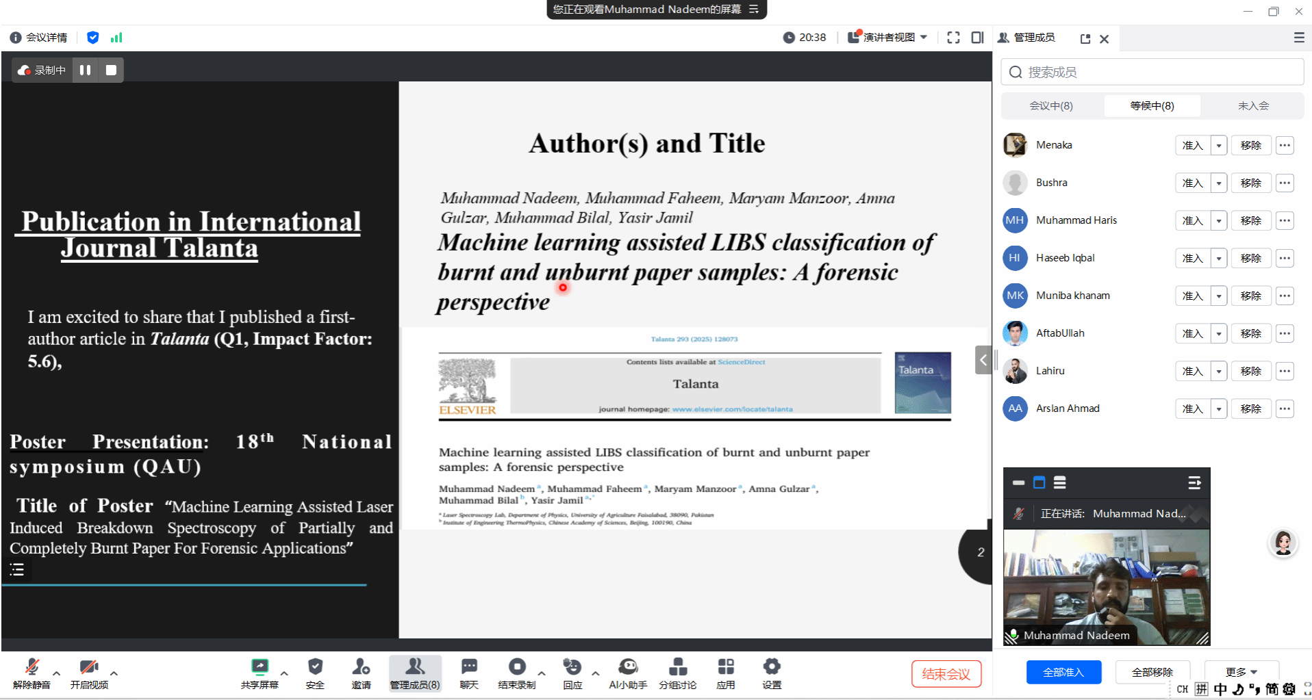 7位博士申请人和1位硕士申请人先后通过线上会议形式,围绕个人情况、科研履历、来华学习研究计划进行汇报展示。在面试进行的过程中,老师们以严谨负责的态度对职工进行指导,从学术能力、外语水平、研究兴趣等多方面综合评估,严格把握申请者的优势并充分挖掘其科研潜力。