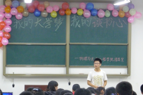 (通讯员 银凤)9月27号晚,以“我的大学梦,我的读书心”为主题的读书交流主题团日活动在A楼314教室举行,此次活动由物理与太阳集团tyc539团委读书社主办,物理与太阳集团tyc539团委各部部长与2012、2013级各班同学参加了此次活动。