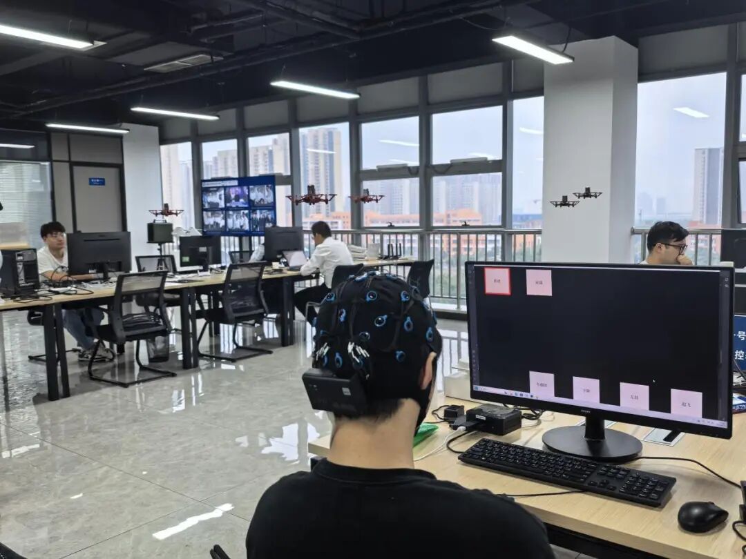佩戴脑电帽通过脑机接口装置将特定脑电波转化为可被执行的控制指令心至目及无人机应念而起上升、下降、前进、翻转、散开……真正实现了“意念所至,飞行所达”的人机协同新境界。