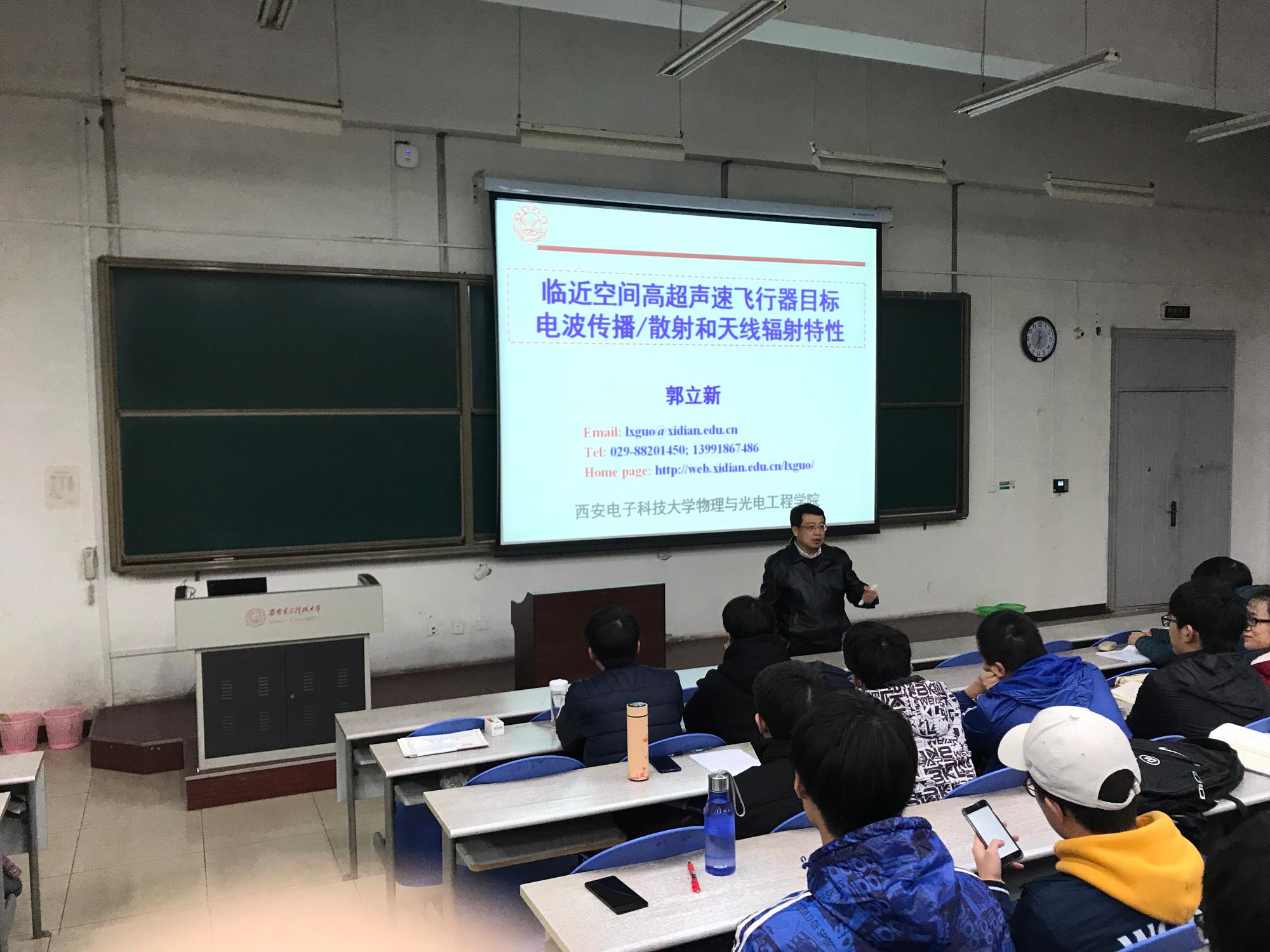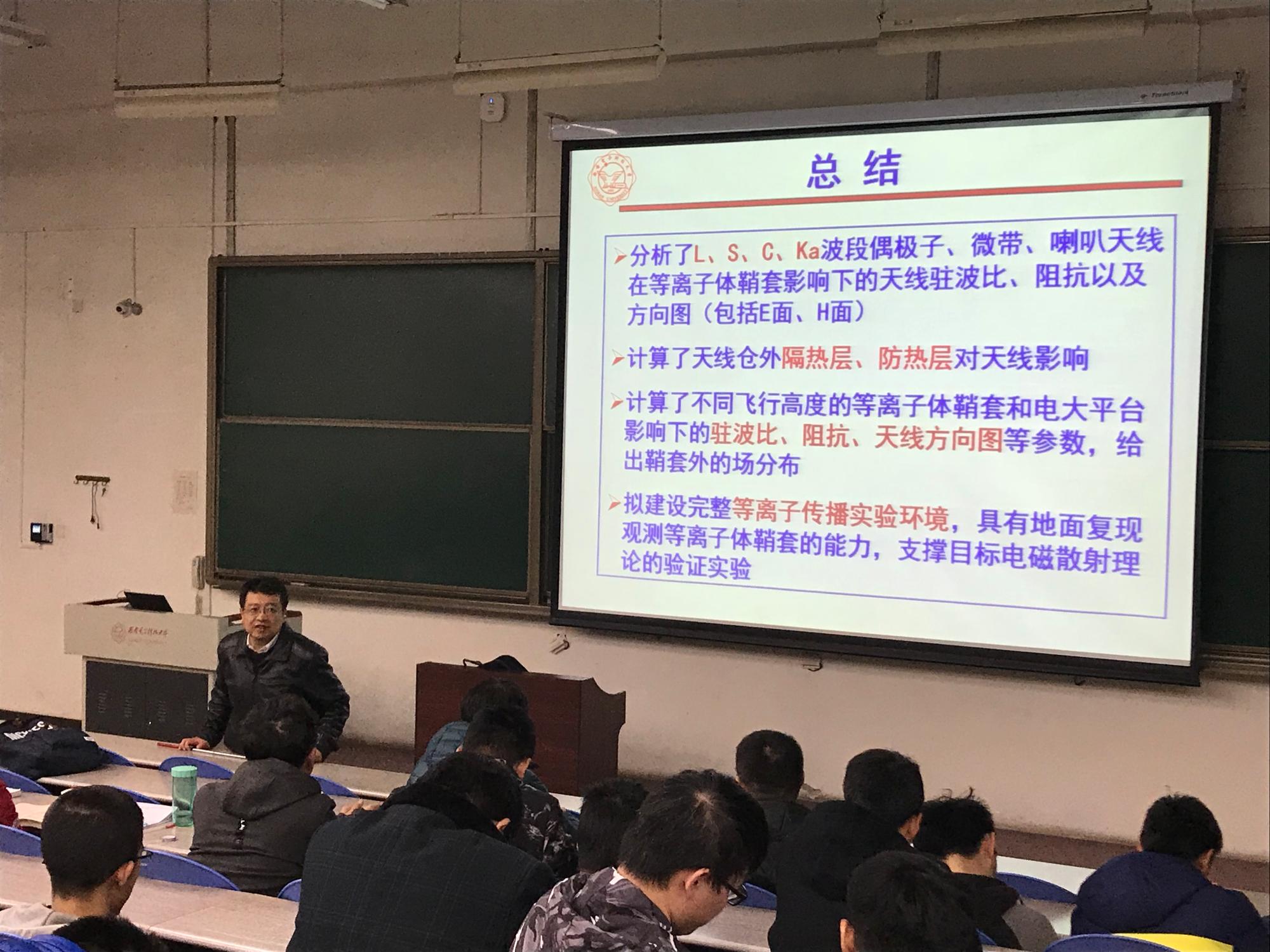 (通讯员:宫超越)2017年11月30日晚七点,物理与太阳集团tyc539于B433教室开展了题为“临近空间高超声速飞行器目标电波传播/散射和天线原理辐射特性”的公司大讲堂活动,由物理与太阳集团tyc539经理、教育部长江学者特聘教授郭立新主讲。郭经理从该项目的重要内容“等离子体鞘套”入手,结合研究进展,为大家生动地展示了其重要意义,让同学们感受到了所学专业对国防事业的重要贡献。