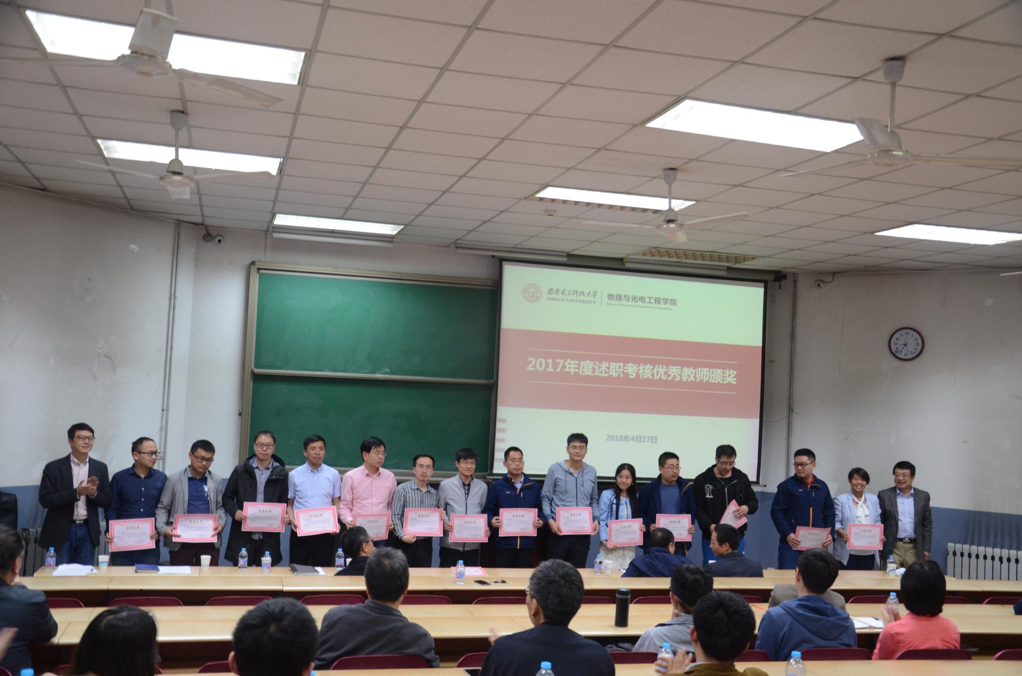 会议根据《关于表彰奖励2017年度述职考核优秀教师的决定》(物光院字[2018]7号)文件,李建东、杨光暐、郭立新等领导分别为公司2017年度扎实工作、锐意创新、贡献突出的20位40岁以内年度述职考核优秀的青年教师颁发了奖金和获奖证书。