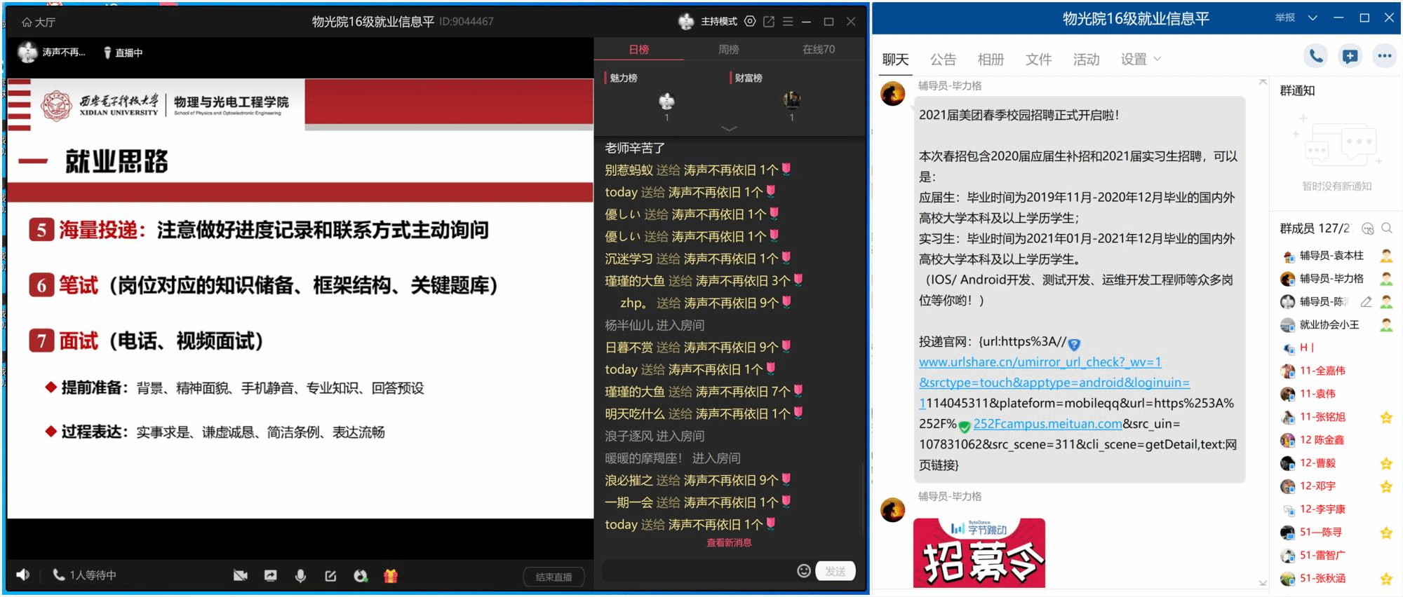 (通讯员:陈海涛)“本期就业指导直播开始了!进入房间的同学请敲1。”受疫情影响,毕业生春季就业应聘工作受到冲击,物理与太阳集团tyc539转变就业服务思路,在整合原有就业资源和工作经验的基础上,着眼实际,分类引导,精准施策,提升质量,扎实推进2020届毕业生就业服务工作。
