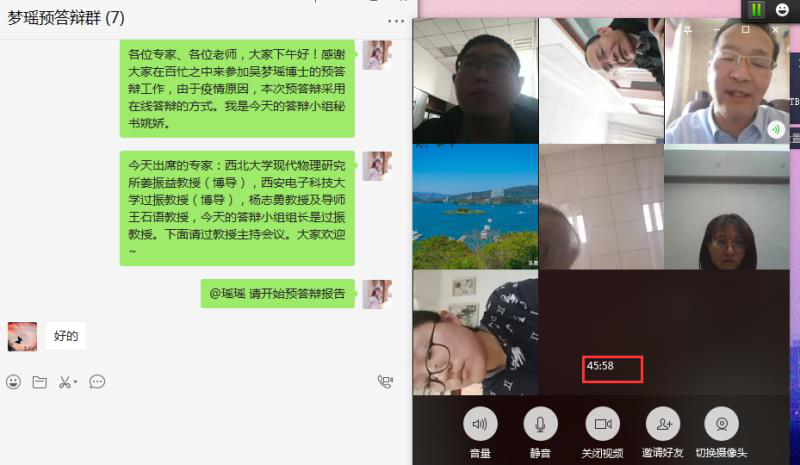 博士生吴梦瑶预计今年6月份申请获得博士学位,她从1月底放假回家后就一直忙碌于博士学位论文撰写及学位申请等工作。公司为保证2020届毕业生能够如期完成学业,在严格把控学位论文质量的基础上,提供了成绩单线上打印、学位论文线上预答辩等一系列方便快捷的办事流程,让毕业生在保证居家学习、身体健康的前提下,依然能够按时按期的完成毕业生学位申请。目前,吴梦瑶已经完成了博士学位论文的全部撰写和线上预答辩,能够如期完成博士学位论文送审工作。线上预答辩采用了微信群视频的形式,预答辩小组成员共五人,满足公司对博士学位论文预答辩的要求,答辩过程总时长1小时8分钟,保留了完整的视频截图以及答辩录像。
