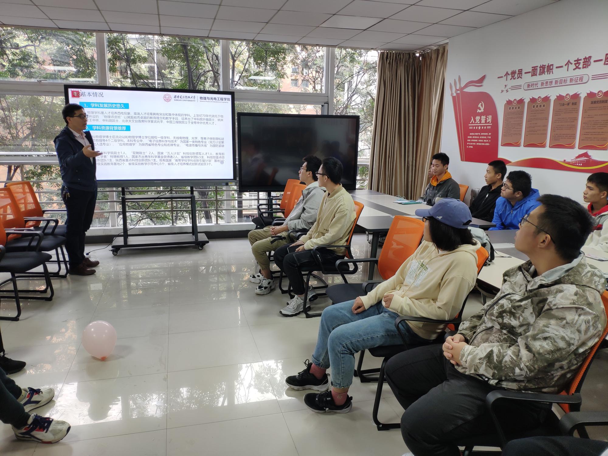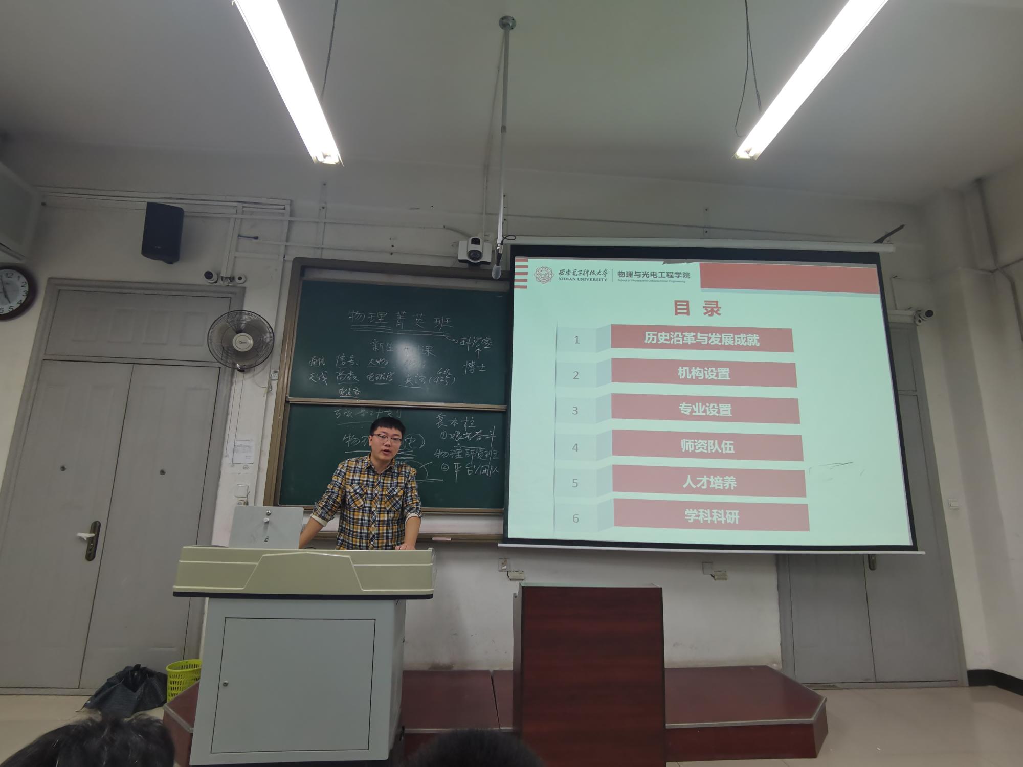 10月15日下午,物理与2020级新生辅导员袁本柱在A楼220教室为物理菁英班全体同学带来了一场别开生面的新生研讨课。课堂由物理团队班的故事展开,他在课上说到,发扬“艰苦奋斗”的西电精神是学好基础学科的必要条件,肯吃苦,多钻研才能悟出物理的乐趣。同学们纷纷表示将潜心学习,重现辉煌。最后,课程在轻松愉快的氛围中圆满结束。