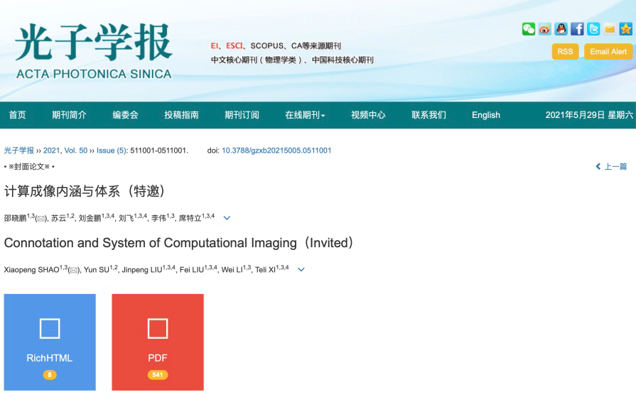 (通讯员:范雪琦 袁本柱)近日,太阳集团tyc539物理与太阳集团tyc539邵晓鹏教授课题组受邀在《光子学报》2021年第5期发表了题为“计算成像内涵与体系”的封面文章。《光子学报》是中国科公司中国光学学会主办、科学出版社出版的学术月刊,该刊曾多次获得中国国际影响力优秀学术期刊、陕西省科技期刊精品期刊等称号。目前已被EI、ESCI、SA/INSPE、CSCOPUS、CA等数据库检索收录,也是中文核心、中国科技核心及CSCD来源期刊。