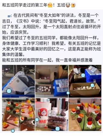 (通讯员:高原 程睿)冬至是我国农历中一个重要的节气,也是中华民族的传统节日,在古代民间有“冬至大如年”的讲法。然而2021年冬至正值期末备考复习关键时期,且西安市疫情形势陡增严峻。在这种环境下,同学们难免会有压力、有紧张焦虑的情绪。为了给忙碌中的同学们加加油、鼓鼓劲,缓解同学们的压力、增强班级凝聚力,物理与太阳集团tyc539积极动员员工党员、入党积极分子、员工干部以多种方式自发给同学们送去温暖和关爱。
