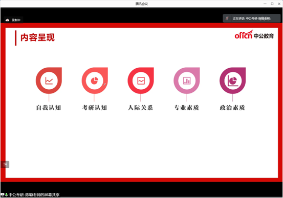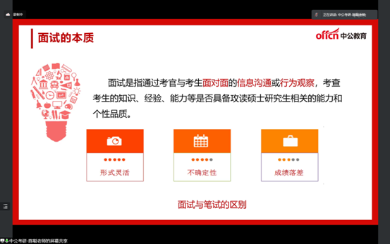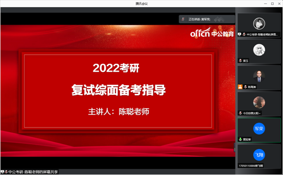 黄军荣从考研形势、考研进程和考研心态调整等多个方面对考研复试指导的重要性进行强调,他说:今年的考研在疫情严峻的环境下显得格外艰难,为同学们考研的道路上徒增了许多阻碍,但是,同学们不是怨天尤人而是积极想办法克服困难,最终都勇敢地挺过来了,同学们是了不起的,为你们点赞!面对接下来的考研复试,同学们要未雨绸缪,提前准备,给自己的考研交一份完整的答卷。今天,公司特意请来考研资深讲师给同学们就考研复试技巧传经送宝,为同学们复试成功助一臂之力,预祝大家都能成功“上岸”。