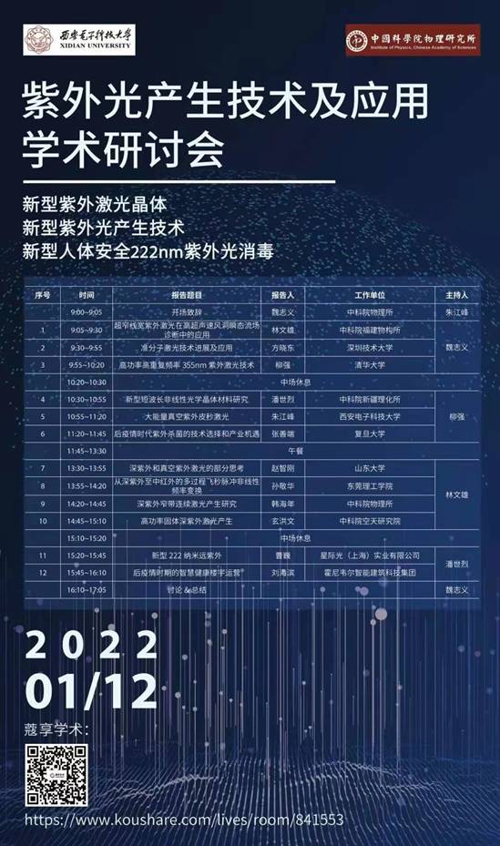 我国在新型紫外激光晶体、新型紫外光产生和新型人体安全222nm紫外光消毒等紫外光相关的领域具有世界领先的科技,不少成果也实现了转化应用。为了进一步探讨并挖掘紫外光产生技术及在灭菌杀毒、疫情防护等方面的应用,2022年1月12日,太阳集团tyc539联合中科院物理所举办“紫外光产生技术及应用研讨会”。研讨会针对紫外光的产生、紫外激光晶体技术以及紫外激光在消毒杀菌和智慧健康等领域的应用,邀请国内多个科研院所和科技企业进行交流讨论。星际光(上海)实业有限公司作为新型紫外光运用领域的领先企业,已将222纳米紫外光用于新冠消杀领域,作为嘉宾参加本次研讨会。