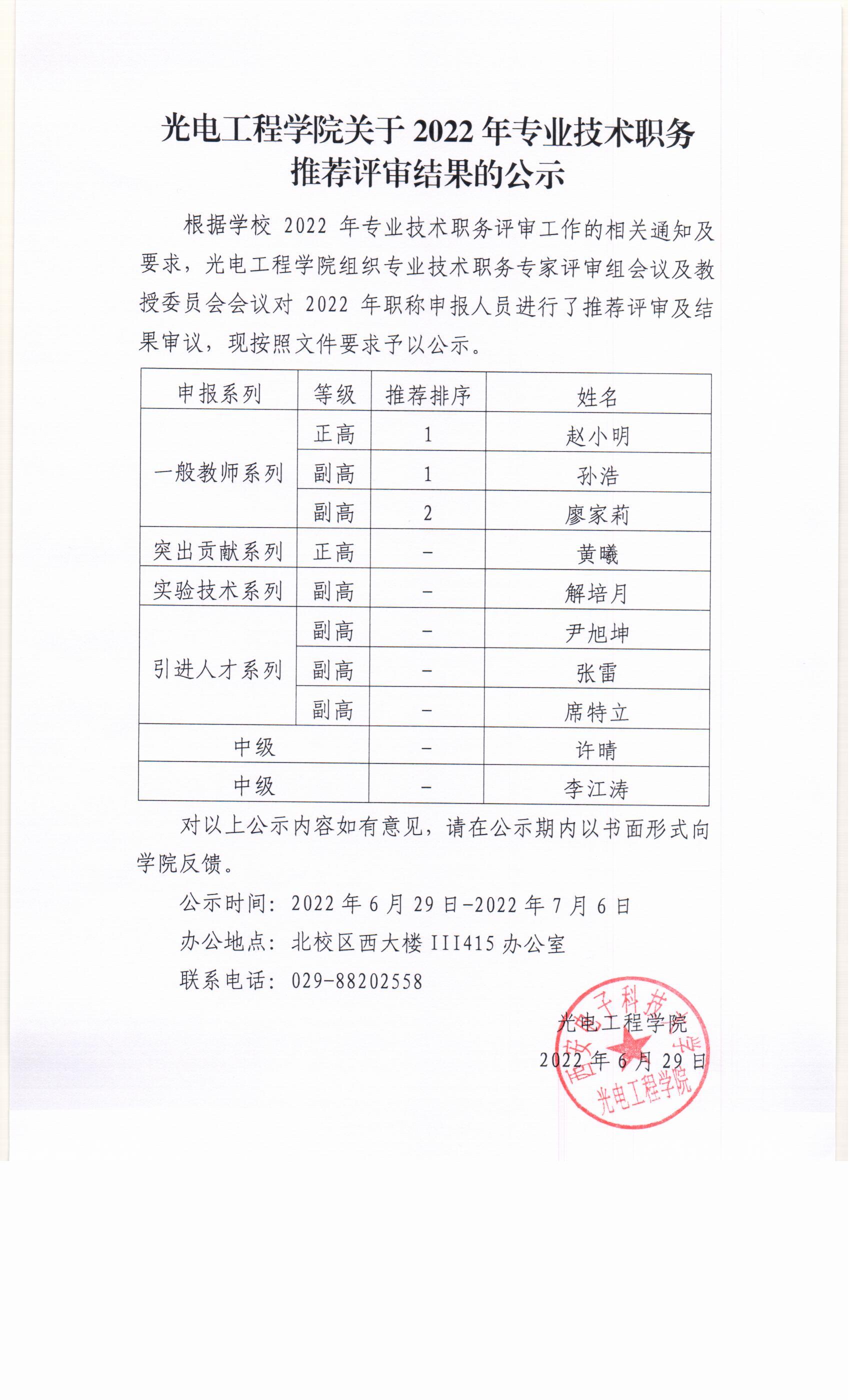 公司关于2022年专业技术职务推荐评审结果的公示