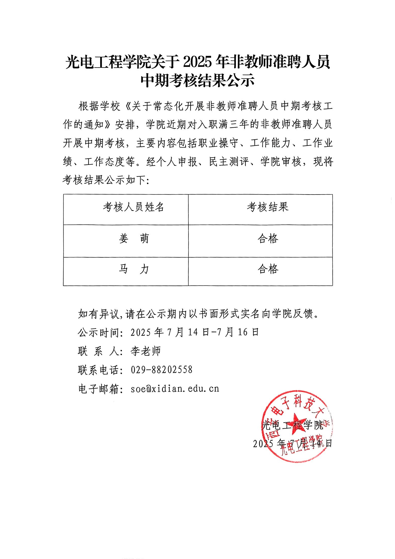 公司关于2025年非教师准聘人员中期考核结果公示