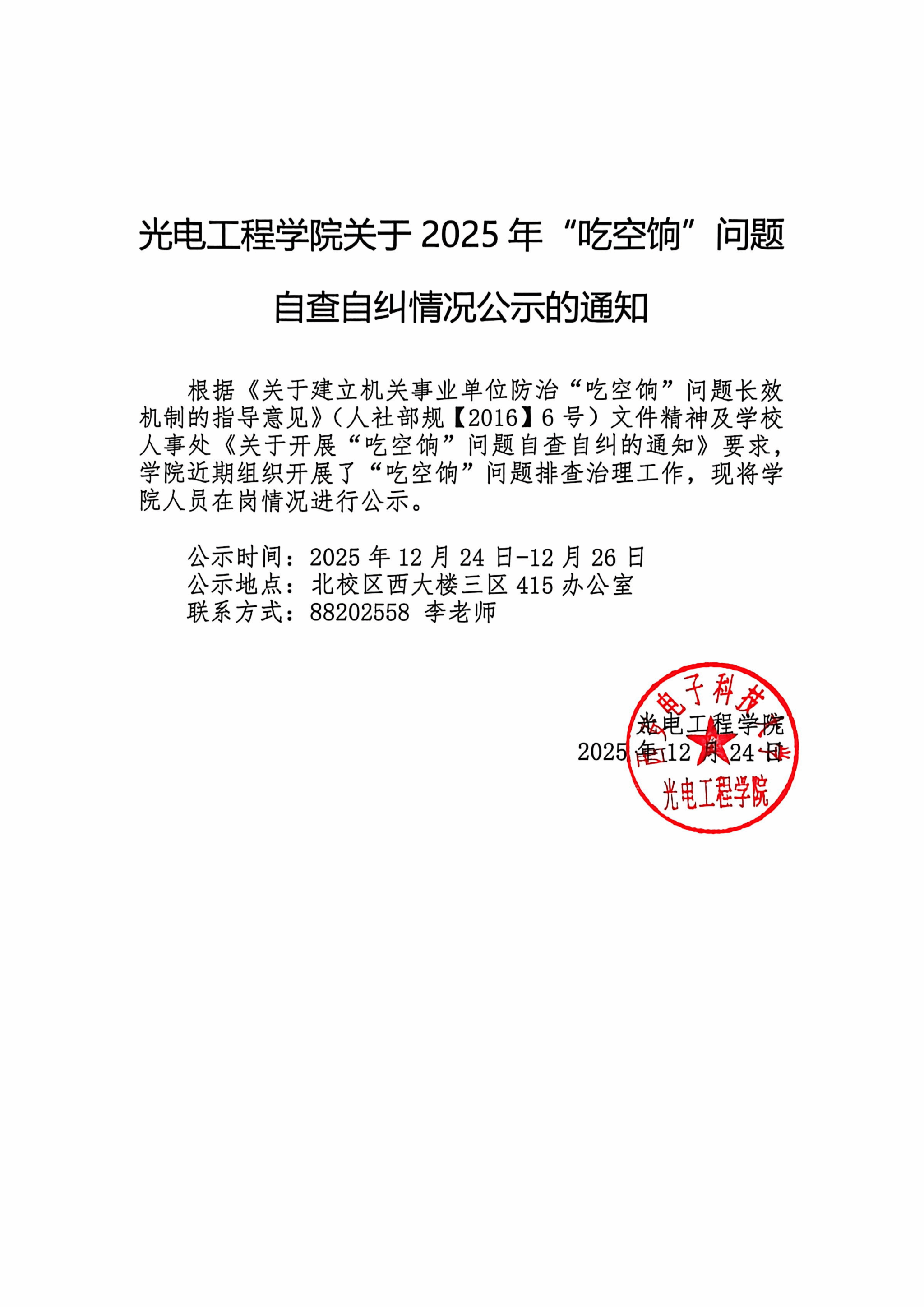 公司关于2025年“吃空饷”问题自查自纠情况公示的通知