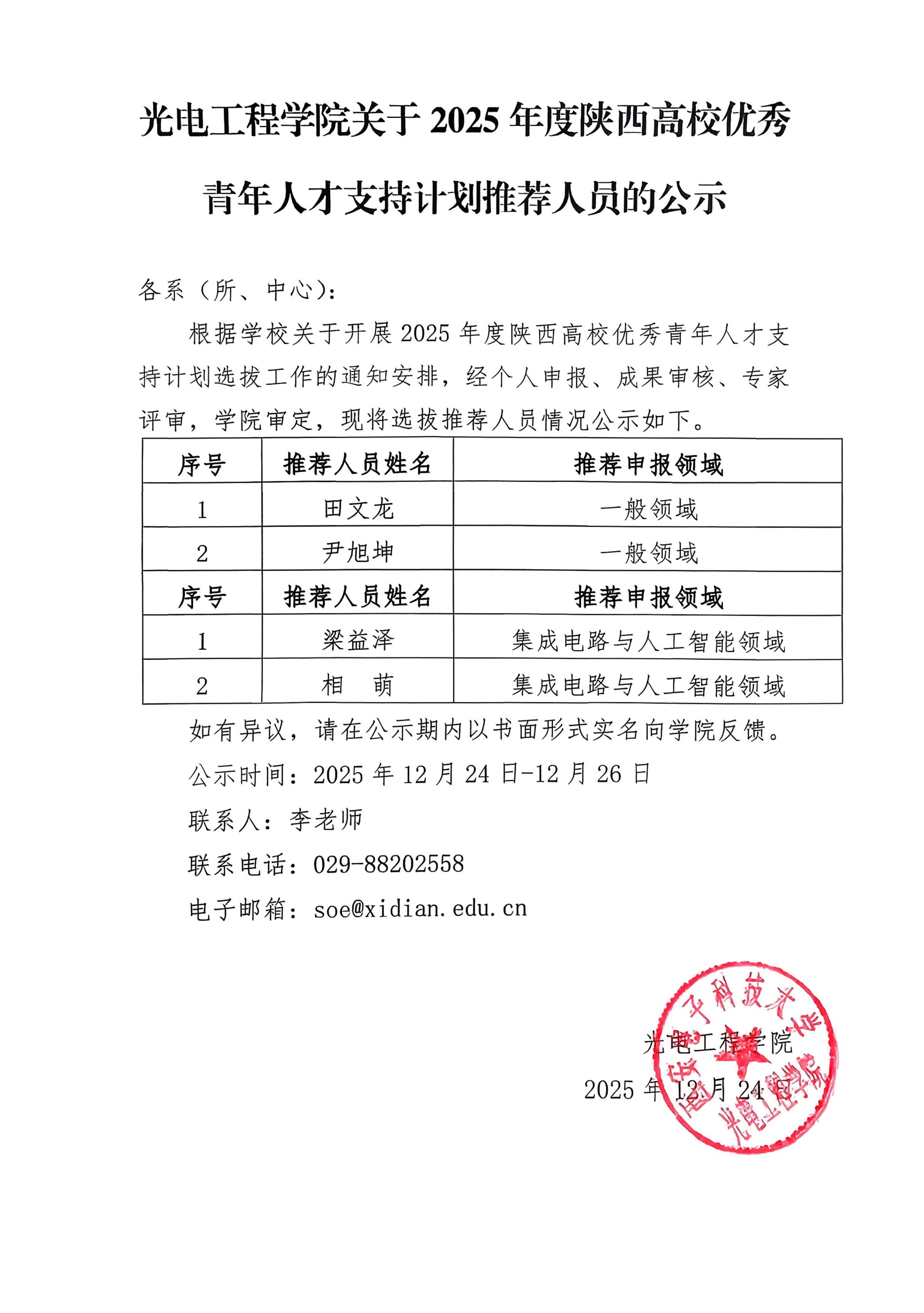 公司关于2025年度陕西高校优秀青年人才支持计划推荐人员的公示