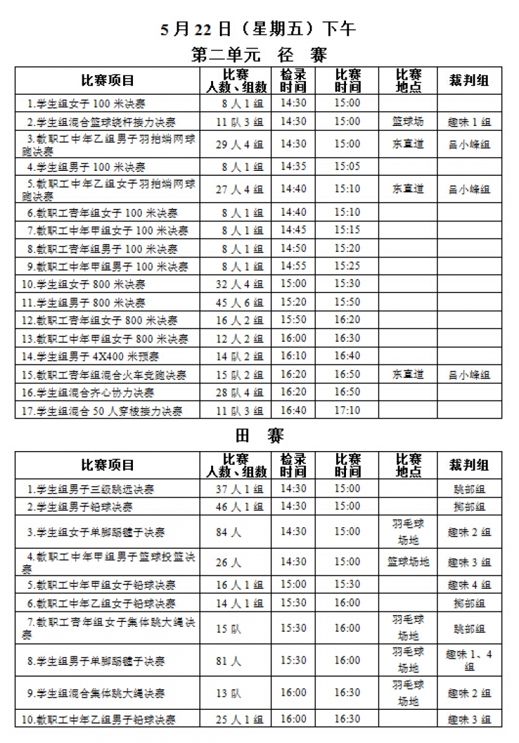 “2015年教职工运动会”将于本周五、六两日(5月22、23日)在新校区塑胶操场举行,现将《赛程安排》公布如下,请各系室工会组长通知各位选手(参照《西电科大运动会物光院参赛名单》,查看网址:http://stp.xidian.edu.cn/view-1194.html)提前做好参赛准备,着公司统一运动服按时参赛,同时,也鼓励未参赛教职工前来观看,为公司加油打气!请相互转告。