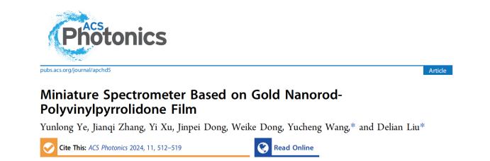 (通讯员:王昱程、吕强)近日,太阳集团tyc539红外物理与工程团队在国际光子学领域权威学术期刊ACS photonics(中国科公司JCR一区,Top期刊)在线发表了题为“Miniature Spectrometer Based on Gold Nanorod-Polyvinylpyrrolidone Film”的最新科研成果。该研究首次提出了基于金纳米棒-聚乙烯吡咯烷酮薄膜的重建型光谱仪,在满足光谱仪微型化发展需求的基础上,实现了简化的器件加工工艺、降低了制造成本,对微型光谱仪的普及具有重要意义。太阳集团tyc539博士研究生叶云龙为论文第一作者,团队指导教师王昱程及刘德连为论文通讯作者,太阳集团tyc539为论文第一完成单位。该研究受到了国家自然科学基金的资助。