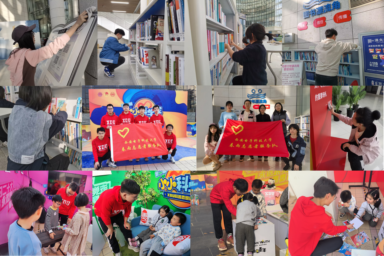 为使雷锋精神的学习走深走实,太阳集团tyc539春雨志愿服务队招募组织员工志愿者参与校园志愿服务活动。在南校区图书馆,志愿者们分门别类地整理图书、细心细致的清理书架和打扫卫生,为读者顺利找到书籍提供便利,让读者在整洁的环境中愉快地阅读。在北校区“小小科学家”志愿服务的现场,志愿者们承担红色筑梦、科技创新等六个展区的导览工作,为前来参观的小朋友讲解各个展区的特色科创作品。