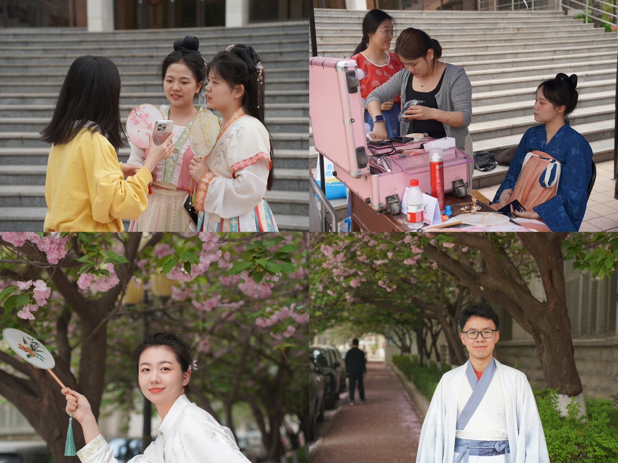 活动现场准备了40余件男女不同款式的汉服,师生们凭令牌挑选换取心仪的汉服并进行简单妆造,不一会儿便摇身一变,或是娇俏可爱的小师妹、或是潇洒肆意的侠客、或是端庄优雅的公子闺秀……春光明媚之际,师生们着装色彩鲜艳却不失古典之美,轻盈的丝质衣摆随微风轻轻摇曳,宛如一幅动人的春日画卷。