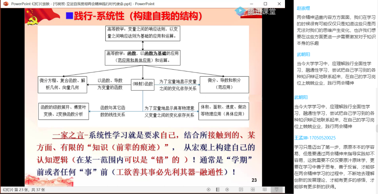 本次党课通过线上授课的形式让同学们更全面地学习了两会精神,重温时代使命。教师党支部书记弓树宏老师声情并茂地教学更加坚定了同学们努力成为一位承担时代使命的优秀党员的决心,同时也唤醒了同学们内心为国为民的使命感,为成为优秀中国共产党员打下了坚实基础。