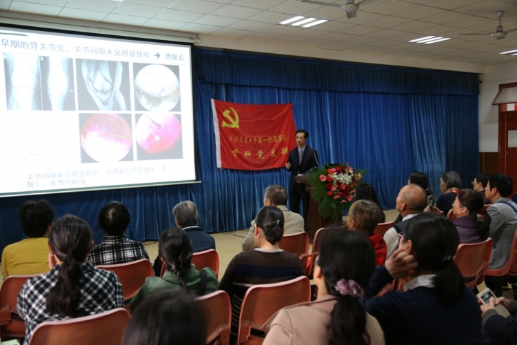 在随后的讲座中,尹战海结合自己的实践经验就有关肩周炎、关节炎、颈椎病、腰椎间盘突出症等常见症状的预防、诊断与治疗做了报告。他通过“自行车车铃不响了,轮胎摩没了,车轴不正了,骑不动了”的比喻,形象地描述了因年龄问题而造成的骨关节等相关病症的病理,深入浅出地讲解了在如何合理有效地应对疼痛、病变等各种症状。就颈、肩、腰、腿、膝关节等重点部位的基础护理、药物治疗、复健强化、术后恢复等方面进行了细致的阐述。同时告诫大家,预防骨关节问题的关键就是“省着用”,在对身体的管理上应时刻做到适合、适度、适当,才能保持良好的健康状态。