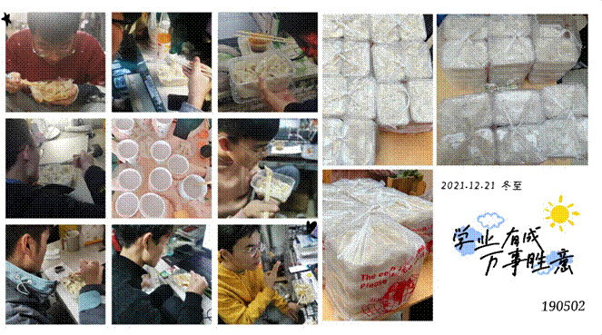 (通讯员:高原程睿)冬至是我国农历中一个重要的节气,也是中华民族的传统节日,在古代民间有“冬至大如年”的讲法。然而2021年冬至正值期末备考复习关键时期,且西安市疫情形势陡增严峻。在这种环境下,同学们难免会有压力、有紧张焦虑的情绪。为了给忙碌中的同学们加加油、鼓鼓劲,缓解同学们的压力、增强班级凝聚力,物理与太阳集团tyc539积极动员员工党员、入党积极分子、员工干部以多种方式自发给同学们送去温暖和关爱。190...