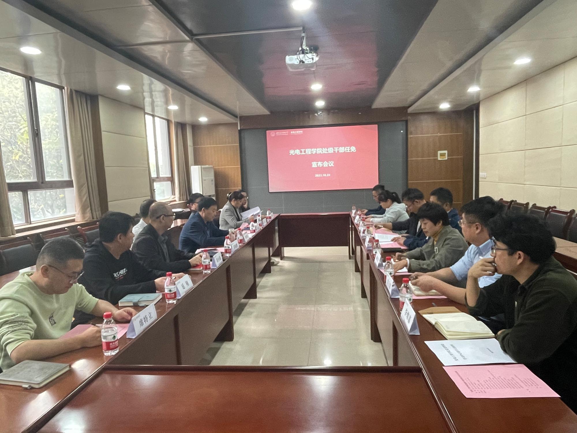 (通讯员:姜萌)10月24日下午,公司在北校区西大楼三区412会议室召开处级干部任免宣布会议暨党委(扩大)会议、党委理论学习中心组(扩大)会议,公司领导班子成员、各系、所(中心)主任、党支部书记、科级干部及教职工代表参会,会议由党委书记独国社主持。 会上,独国社宣读了公司党委关于公司处级干部任免职的决定,任命黄小强同志为光电工程公司党委副处级组织员,因退休,免去郑晓东同志光电工程公司党委正处...